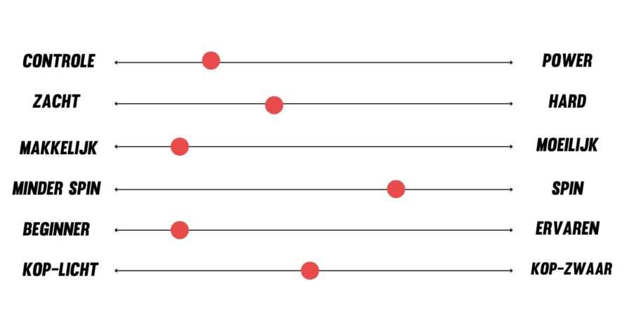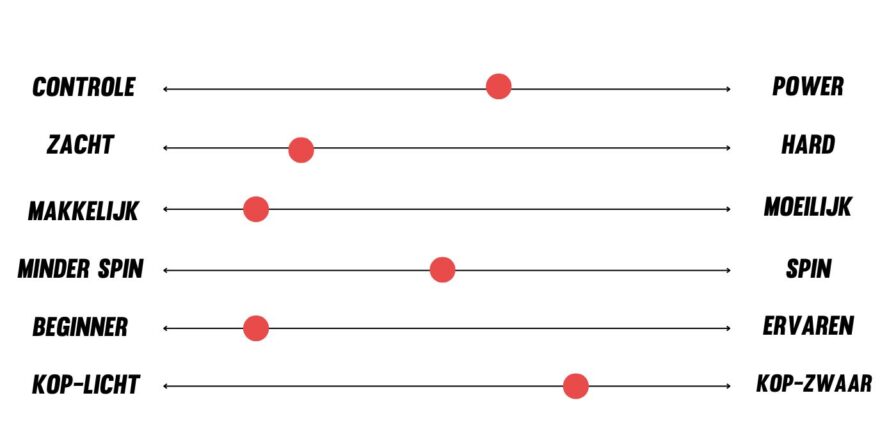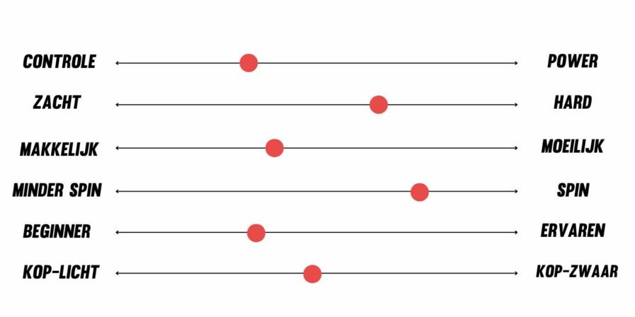 Beginner vs. Ervaren: Geeft aan voor welk type speler het racket bedoeld is. Hoe moeilijker het racket is om mee te spelen, hoe hoger de indicatie richting gevorderde spelers zal zijn.