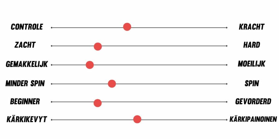 Makkelijk vs. Moeilijk: Geeft aan hoe moeilijk het racket is om mee te spelen. Een kleiner sweetspot maakt het racket moeilijker om mee te spelen, omdat je de bal precies in het sweetspot moet raken voor een zuivere slag.