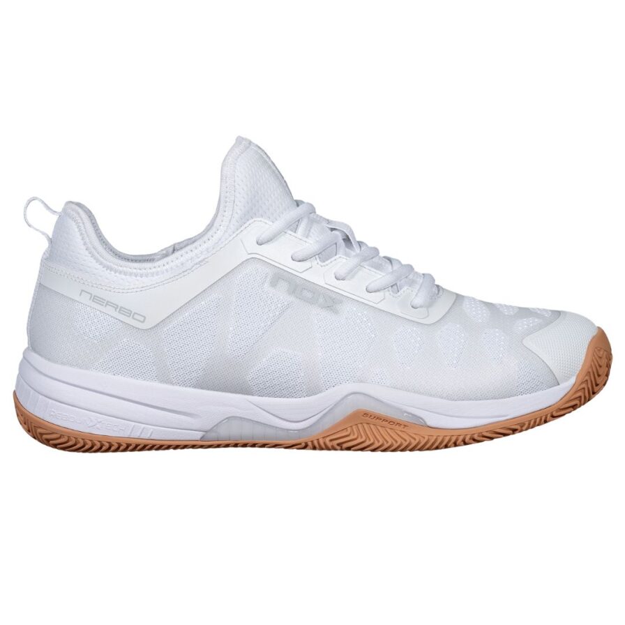 De populaire Nerbo padelschoen van Nox is terug in een stijlvol en modern ontwerp – met een wit bovenwerk en klassieke bruine rubberen zool. Perfect voor spelers die comfort, bewegingsvrijheid en een strakke look waarderen op de baan.