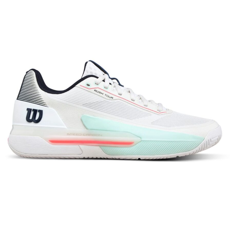 Wilson Rush Tour 5 White/Bay/Fiery Coral is ontwikkeld voor de ambitieuze speler die maximale stabiliteit, comfort en snelheid verlangt. De nauwsluitende EndoFit-constructie omsluit de voet en biedt een intuïtieve pasvorm, terwijl het Dual Axis Speed Carbon Chassis uitstekende laterale controle biedt, zodat je veilig kunt stoppen, snijden en accelereren. De lichte Gammaweave mesh-bovenkant combineert ademend vermogen en duurzaamheid om het tempo punt na punt hoog te houden. De Super Foam-tussenzool en Drop-In Performance Sockliner bieden responsieve demping en energieteruggave tijdens lange, intensieve wedstrijden.